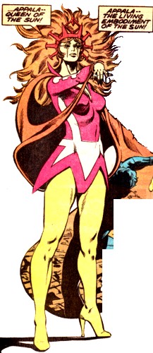 Powers/Abilities: Apalla possesses the full power of Earth's sun, although there are limits to the powers she can unleash without destroying that which she would preserve. She can take on human form, generate nova explosion level heat and force, etc. It is likely that her powers are somewhat decreased in humanoid form.