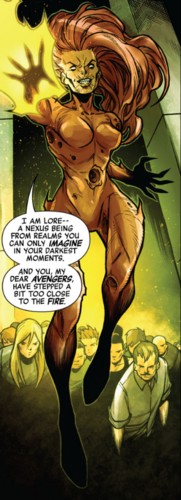 (Scarlet Witch I#4) - Lore overpowered Wanda and Agatha and explained her goals, after which Wanda managed to cast a hex which brought Lore into physical form. Lore rose an army of the dead to attack Wanda, but the Witch managed to grant them eternal peace. Agatha recovered to join the fight, but a stray blast freed Pandemonium, who grabbed and pinned Wanda. Lore, caring little for her ally, blasted both of them, and then seemingly destroyed Pandemonium when he complained about the treatment. The Avengers were released from Lore's control as she gathered her energies into herself, and Lore then attempted to summon forth the spirits of all of the Nexi she had ever slain, so she could drain their powers to rejuvenate herself so she could destroy Earth-616. However, the spirits of the Nexi turned on Lore, tearing her apart. The Scarlet Witch then hurled Pandemonium's sword into Lore, who apparently exploded.