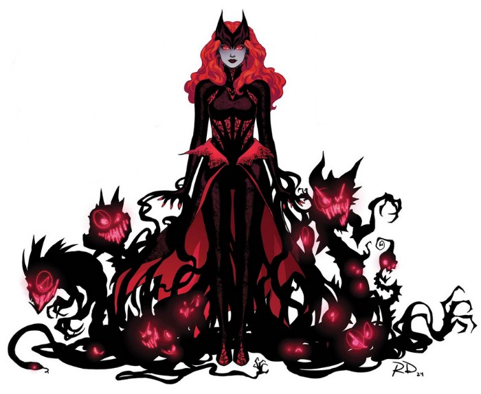 Lore's new design for the 2024-2025 Scarlet Witch series was by Russell Dauterman, which drew inspiration from Scarlet Witch's look from the MCU movie Doctor Strange in the Multiverse of Madness (2022).