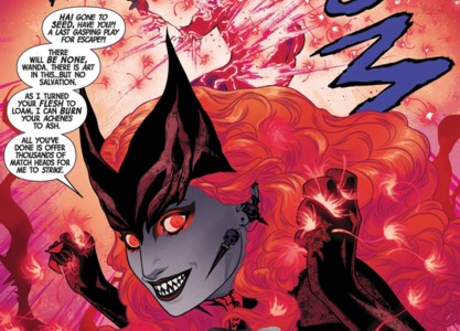 (Scarlet Witch I#3 (fb) - BTS) - Lore targeted the Earth-616 dimension's nexus being, Wanda Maximoff, the Scarlet Witch. She recruited Master Pandemonium as her agent, freeing him from Mephisto's realm of Hell.
