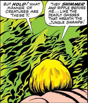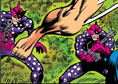It was unclear if it was the Reptile-Men using a camouflage device to ambush Ka-Zar (see third image above -- I'm just assuming it was because of the green coloring, and the one in the center seems to be wearing a pointed eye-mask). It may have been some overzealous Golden People put on the defensive by the recent attacks, rather than the Reptile-Men.