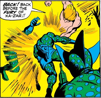 Ka-Zar then fought back a group of Reptile-Men and convinced them to flee by revealing their leader's defeat and loss of power.