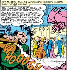 Sleepiness was released days later at a wealthy social gathering; when all the party-goers fell asleep, the Sorcerer robbed them of their valuable jewelry. |