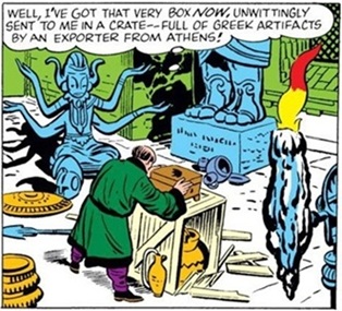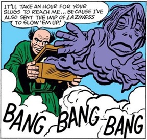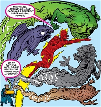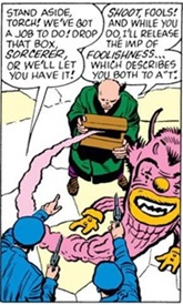 With the assistance of the demonic Imps, the Sorcerer began a career of robbing banks, art museums, and jewelry stores. He even doused the Human Torch by having one of the Imps splash the young hero with a tidal wave.
