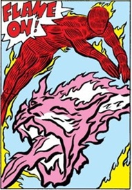 The Sorcerer turned his attention back to finishing off the Human Torch (who was almost dry following his dousing by Flood); stalling for time, the Torch requested that he'd like to die as he lived, by the power of flame, so the Sorcerer released the fiery imp of...