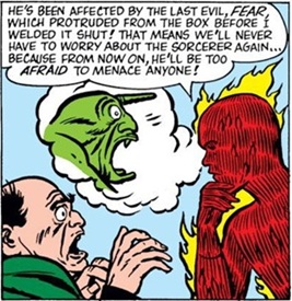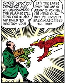 However, the Sorcerer fell victim to the Torch's plea to allow him to choose which Imp would kill him; the Torch chose Flame, which quickly rekindled the Torch's own flame. An instant later, the Sorcerer realized that he'd been tricked, and just as he was about to unleash all the Imps of the Box upon the Human Torch, the Torch quickly snagged the mystic container and welded it shut... but not before the Imp of Fear partially emerged and affected only the Sorcerer himself. The Torch flew away with the sealed Box and dropped it in the deepest part of the ocean.