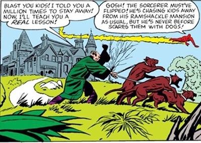 background]; Sorcerer using dogs to chase off neighborhood kids)