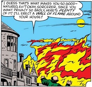 (Strange Tales I#109/1) - While the Human Torch was flying overhead, he spotted the Sorcerer running off some neighborhood kids with his pack of guard dogs. The Torch stopped him from threatening the kids and mocked him, then tried to teach him a lesson by temporarily surrounding the Sorcerer's mansion with a wall of flame, so he could have his "privacy"; but when the Sorcerer complained that the encircling flames would prevent him from coming and going as well, the Torch pointed out that he couldn't have it both ways, and if he wanted freedom of movement, others must have it as well. The Sorcerer begrudgingly asked the Torch to extinguish the wall of fire, but warned him that he wouldn't forget about this humiliation.