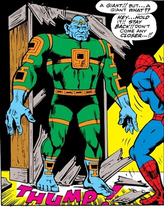 Used by the Sorcerer (Jonathan East [...who also referred to it as the Hollow Man]), the Synthetic Man was 10 feet tall (...at least its crate was, as per Spider-Man estimation). It possessed Class 25 Strength, and could alter its body from rock-hard to a pliable form able to deform with any impact. It could also fire a concussive force blast from its jeweled headband. The giant robot was remotely controlled by the Sorcerer from his New York City home--he projected his consciousness into the Synthetic Man with his Psycho-Intensifier. Stored in a New Orleans warehouse, the Synthetic Man was contained in a large crate. After manipulating Spider-Man (Peter Parker) into taking a trip to New Orleans and going to the warehouse, the Sorcerer activated the Synthetic Man and had it punch its way out of the crate. |