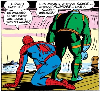 With its guiding force gone, the Synthetic Man turned and passed by Spider-Man, then walked off a dock into the Gulf waters.