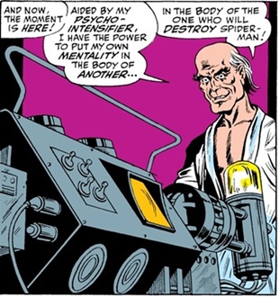 Having now achieved full mastery of his psychic powers, he returned to the USA where he designed and built a Psycho-Intensifier. The Sorcerer now thought to test his prowess by vanquishing the hero Spider-Man, whom he perceived as the most dangerous man of all. He first caused Spider-Man to suffer from weakness and loss of equilibrium. The Sorcerer then applied pressure to the head of a Juju doll of Spider-Man, causing the hero to have an intense migraine headache.