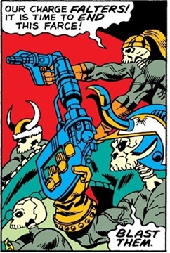 Tyrk was also served by legions of more normal human-like denizens of the Other Realm. Like Tyrk (and Lunatik, and the Nilffim-Riders), they had them funky all-white eyes with dark lining. They were armed with some form of handguns. --Marvel Premiere#46 |