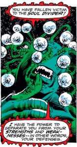 Powers/Abilities: Visimajoris' main power is to cause others to divide into duplicate forms of themselves, each possessing a fragment of the abilities of the original. He does this to disorient his foes and lower their ability to function, even to the point of them becoming too weak to exist. It also can fire blasts of mystic energy. Its eyes serve as the release points for its mystical attacks. Apparently if Visimajoris is defeated, his victims are reintegrated.