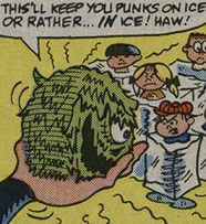 Iceberg Lettuce was created from the vegetable seeds sown by Doktor Frankenbeans outside R.U.I.N. Labs. Toxic chemical water quickly grew it to full size.