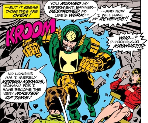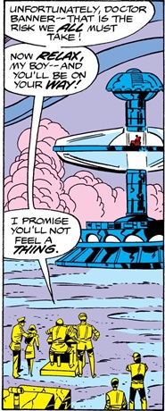 (Incredible Hulk II#204) - Kronus and General Ross offered Bruce Banner the opportunity of going back in time and reliving the events that led to him becoming the Hulk -- armed with the knowledge of what had happened back then, Banner could thus correct that event, and thereby prevent the Hulk from ever existing. After some thought on the matter, Banner agreed to the procedure.