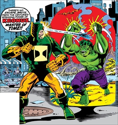 Much like his Earth-616 (mainstream Marvel Universe) counterpart, the Kerwin Kronus of Earth-20476 was a brilliant scientist in the field of time-travel; he created the Time-Shuttle, which could transport a person to the past and return him to the present. While operating his own Time-Shuttle, the Kerwin Kronus of Earth-616 had actually transported Bruce Banner to the past of Earth-20476, on the day the Gamma Bomb blast transformed him into the Hulk (@ Incredible Hulk I#1). Banner managed to take shelter and avoided being exposed to the radiation of the bomb, and thus prevented himself from ever becoming the Hulk; however, Rick Jones was killed, and thus this divergent reality was created. When Banner-616 returned to the present of Earth-20476, the Kronus of this reality greeted him and was eager to know every detail of his time-journey; but Banner was so emotionally distressed by the death of Rick that he had to be taken to a hospital (see comments). While sleeping in his hospital bed, Banner had a nightmare wherein Kronus was the super-powered "Master of Time," and he wanted to punish Banner because he ruined Kronus' time-experiment. In this nightmare, the time-power of Kronus transformed Banner into the Hulk, and the two clashed. Kronus then transported the Hulk one-million years into the past and entrapped him behind a time-barrier. After Kronus removed the barrier, the Hulk punched him, and continuously pummeled the "Clock-Man's" head, cracking his foe's helmet like an eggshell. When the Hulk transformed back to his human alter ego, Banner looked down at the lifeless body of Kronus and saw the dead Rick Jones' face inside the villain's shattered helmet. After being awakened from the frightening dream by his wife Betty (see comment), Banner felt responsible for Rick's death, so he rushed to Kronus' Time-Shuttle and was again transported to the past; he relived the detonation of the Gamma Bomb, but on this occasion, he saved Rick, and was once again hit by the radiation of the blast -- this "correction" allowed Banner to return to the present of his own reality. The nightmare version of Kerwin Kronus wore an armored suit and had strength comparable to that of the Hulk. He could also project a beam of temporal energy from the analog clock on his helmet's forehead; this energy gave him the power to transport people and objects backward or forward through time. (Comment: The images of this sub-profile are only of the super-powered Kronus from Banner's nightmare. The actual Kerwin Kronus of Earth-20476 seemed to be about the same as his Earth-616 counterpart -- the headshot image in the main profile is actually Kronus-20476.) --Incredible Hulk II#204 |