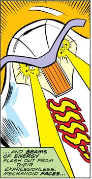 Robots named after the Rakshasas, demons from Hindu mythology, they were build by Jan Maarshall; they served as the guards and security at the Nest. They could fly, fire energy blasts from their "eyes," and tear through the hull of a jet with their tentacles and pincers. (Comment: Slightly different models of Rakks acted as ground-based sentries for the Nest -- it was unrevealed if these could also fly.) --Marvel Team-Up Annual#1 (1(fb), 1 |
