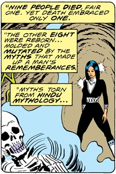 (Marvel Team-Up Annual#1 (fb)) - Nila was closest to the pile, and his mind was the first to be ripped out, twisted, searched for memories, and bombarded with unknown levels of radiation, infusing the rest of the scientists with the stuff of his thoughts, of his mind. Nine people died, but only Marchesi remained dead; the other eight were reborn, molded and mutated by the Hindu stories that made up Nila's remembrances, stories that made them akin to gods.