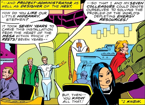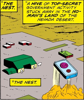 The Nest seemed to be populated by only Mann and seven other humans (see sub-profiles above), along with an unspecified number of robots (Rakks) which acted as security for the facility. One of the Nest's scientists, Dr. Araman Nila, had developed the "Nila Pile," which represented a totally new way of harnessing large amounts of energy. United States Senate special-projects investigator Stephen Marchesi arrived at the Nest one morning, to evaluate the project's progress, and he was given a tour of the installation. But while Dr. Nila was working on his Nila Pile via remote manipulators (waldoes), an earthquake struck. The Nest was rocked by tremors, which shattered the plexi-screen separating Nila's chamber from the rest of the facility, and lethal quantities of radiation flooded the area. The atomic pile, shattered by the earthquake, began to glow and then exploded, obliterating the entire facility, and killing everyone present. The site remained highly radioactive, but the base's eight personnel (excepting Marchesi) were mutated into "gods" by the radiation and returned to life; they continued to dwell within the subterranean chambers of the Nest, until they eventually left Earth -- with the departure of the Nest "gods," the site was purged of radiation. (Comment: Since the Nest was searching for new sources of energy, perhaps it had some connection to Project: PEGASUS.) --Marvel Team-Up Annual#1 (1(fb) |