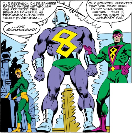 The Gammadroid may not have been a mechanical robot--when the Hulk fought it, there was no sign of damaged parts or electrical circuitry, so maybe it was actually an artificial life-form; and while Cap was carrying the unconscious Banner, he thought to himself, "That gas must have been a defense against either the Hulk or the Gammadroid going berserk..."--what use would gas be against a mechanical robot?