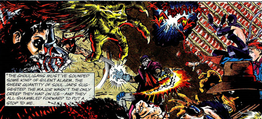 Grimjack#75, p29, pan 2 (in the Ghouligans' wagon, fighting Wolverine,