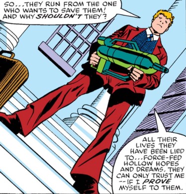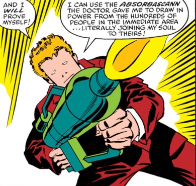 (Marvel Team-Up I#132) - Everyman used the device against Spider-Man (Peter Parker) and Mr. Fantastic (Reed Richards), and managed to overpower both of them; but then Mr.Fantastic pointed out that Everyman wasn't merging with the masses into some perfect union, but actually bleeding the life out of them. Mortified, Everyman dropped the Absorbascann and ran off.