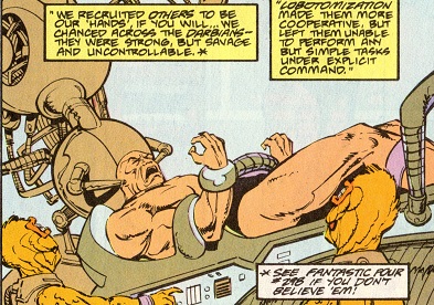 (The Mutant Misadventures of Cloak and Dagger#3 (fb)) - The Byan'Hantandu chanced upon the Darbians, who were strong but savage and uncontrollable. The Byan'Hantandu had the Darbians lobotomized to make them more cooperative, but this left them unable to perform any but simple tasks under explicit commands.