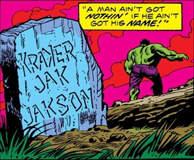 Incredible Hulk II#182, p17, pan8 (crudely carved tombstone by "Crackajack" Jackson's grave; Hulk [background])