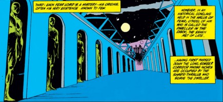The Halls of Fear, the headquarters of the Dweller of Darkness, is apparently a piece of architecture, or a pocket realm, which the Dweller can easily transport with him between dimensions. The corridors are lined by the inert forms of his Shade-Thralls, and there is a large meeting hall. This is the site from which he launched his "Great Fear" plot.