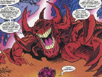The necromantic cybernetic monster who ruled this Earth and created his demon-drones. After learning of his defeat back on Earth-616, he planned to go back in time and prevent it, but the Minions Three managed to find his weakness: He wasn't immune to three indestructible cyborgs tearing the living crud out of him.
