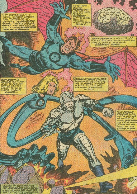 (What If I#6) - When four people piloted a starship into space, they were exposed to cosmic rays that mutated them. Their personality traits affected the ways in which they were mutated: Ben Grimm, who had always loved flying, became Dragonfly; Reed Richards, dominated by his vast intellect, became Big Brain; Johnny Storm, fascinated by things mechanical, became Mandroid; and Sue Storm, whose pliable personality allowed her to adapt and mold herself to fit with her more dominating friends, became the elastic Ultra-Woman. They agreed to use their powers for the benefit of humanity, becoming the Fantastic Four. The Four encountered and triumphed over the Mole Man, the Skrulls, the Miracle Man, and Namor, much like their Earth-616 counterparts.
