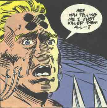 (Nomad II#25)- Now virtually in control of 88 via the S.I.C.C.A.E.L., Nomad had him turn the gun upon his own men, killing them all. Nomad then took out a handgun and shot him in the head, claiming the S.I.C.C.A.E.L. for himself.