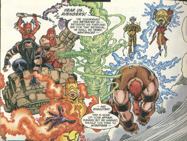 BTS - Uncertain causes--probably the destruction of the Temple of Cyttorak and the subsequent incapacitation of the Juggernaut--served to throw a monkey wrench in the Wager. No other Exemplars would appear until years later, after the Juggernaut had clawed his way through the rubble, made his way to America, and battled the X-Men-- led by Xavier-- several times. Also, Marko, unlike the other Exemplars when they were created, did not initially lose his will to his power source, but retained his full individuality.
