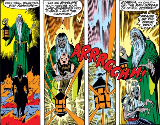 Powers/Abilities: Father Darklyte siphoned the souls of others into his lantern. He used this energy to create a variety of life-like beings which served his will. He created an immense primitive man (Trog), a griffin, duplicates of Katherine Reynolds, and an angel (which turned out to be a demon). He was immune to many forms of destruction, and he could teleport. He was a nihilist: He believed in nothing, and sought to prove that nothing had any meaning. He was more than willing to sacrifice any and all of his followers for his cause. He spouted mostly contradictions, ie. "I come to bring you soothing agitation..to impart to you the wisdom of ignorance, bring you light from the dark side of the moon, or perhaps simply to kill you."