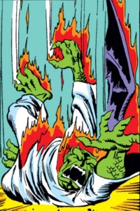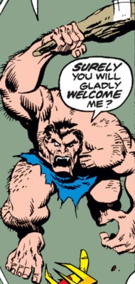 At Daimon's home Father Darklyte created Trog with the energies within his lantern to kill the Son of Satan. Trog, the contradictory future man from one million B.C., tried to hit Hellstrom over the head with his club, Hellstrom destroyed the club with a Soulfire blast from his trident and then struck Trog with the trident in the stomach. The caveman crashed into a bookshelf and vanished as mysteriously as he had appeared. --Marvel Spotlight I#23 |