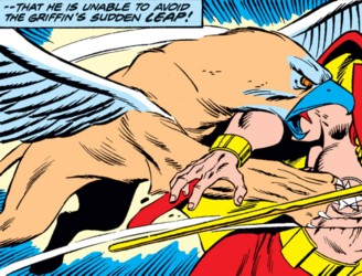 Father Darklye created the griffin with the energies within his lantern near the mansion base of his Legion of Nihilists. It attacked Katherine Reynolds until Hellstrom blasted it with Soulfire from his trident. The griffin countered the fire with energy beam from its eyes and then leapt at Hellstrom to rake his chest with its claws. The griffin lifted Hellstrom up into the sky where Hellstrom broke the griffin's neck with all his remaining strength. The griffin dropped dead to the ground. --Marvel Spotlight I#23 |