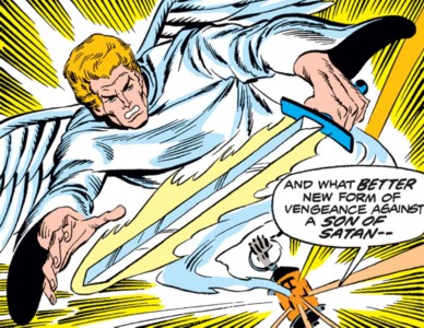 Father Darklyte created this angelic being with the energies within his lantern inside the cavern base of his Legion of Nihilists and sent it against Hellstrom. The Son of Satan blasted the angel with Soulfire from his trident to reveal the angel's true demonic form and kill it. --Marvel Spotlight I#23 |