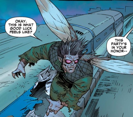 (Punisher VII#8) - The Fly protected himself with his wings from the Punisher's blasts, escaping through a window but with a wounded wing from the Punisher's knife. Bird-Man took the Fly away as other resurrected villains, disguised as (1980s era) Avengers, arrived to engage the Punisher. Soon defeated, the villains regrouped with the Fly's quickly regrown wing slicing the Punisher's motorbike before flying up as reinforcements arrived led by the Hijacker and his tank.