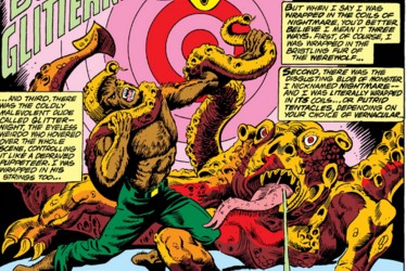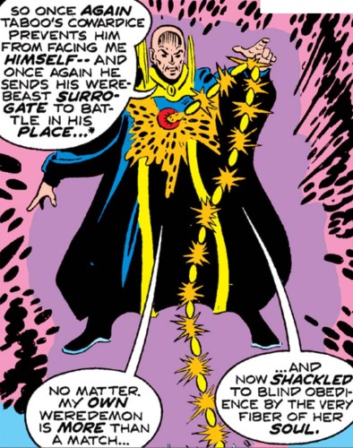 (Werewolf by Night I#28 (fb)) - Almost immediately following the death of Taboo, Glitternight took his corpse and used his powers to claim his soul. He incubated Taboo's soul within one of his black eggs until it hatched into a new body for Taboo. Glitternight revealed to Taboo his plan to murder every person on Earth and use their souls to create an army of demon to serve him. Taboo refused to serve him and so the two fought. Taboo's powers had increased during the incubation, so he was able to hold Glitternight off until he could escape.