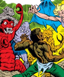 Glitternight questioned Topaz about the location of Taboo, whom they'd all seen die. Topaz had a dream that Russell and his allies to Castle Russoff (Russell's ancestral home), to which Glitternight followed them. They found the reanimated form of Taboo, but were attacked by Glitternight. As it was the first full moon after her eighteenth birthday, Lissa Russell began to transform into a werewolf as well. Glitternight filled her with his energies, and she was instead transformed into a were-demon under his control. Russell, the Werewolf, managed to defeat the were-demon, while Taboo, Topaz, and Buck Cowan teamed up and succeeded in incapacitating Glitternight. The next night Glitternight broke free from his bonds and again transformed Lissa Russell into the were-demon. Taboo sacrificed his pseudo-life by transforming into energy which Topaz used to cure Lissa of her lycanthropy and return her to human form. The Werewolf fought fiercely against Glitternight, and fought off his strongest blasts long enough to tear open the hole in his chest, which apparently released his soul and caused his body to explode. |