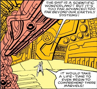 The vessel apparently had no alarms or defensive systems to prevent intruders from entering once it had landed, so while the gigantic Gormuu was rampaging on Earth, Reed Richards easily walked aboard the spacecraft to examine it. After investigating the technology aboard the spacecraft, Reed discovered the connection between it and Gormuu's ability to grow to gargantuan proportions, and he came up with a solution to defeat the extraterrestrial with his power beamer. --Fantastic Four I#271 (fb) |