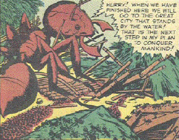 After accidentally shrinking himself the Hank Pym prototype Dr. Perry Moore in Mystic#57 (March, 1955) "Trapped In The Ant Hill!" fled into an ant hill to escape other insects and discovered ant scientists trying to create a means (growth serum? --it was in a tiny bowl) to combat humanity.