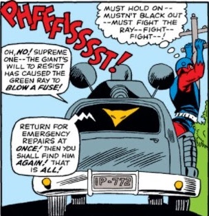 (Tales to Astonish I#67/1) - While driving in the station wagon, Loko spotted Giant-Man repairing a loose high-tension cable on an electrical pole. Attempting to steal the hero's growth power, Loko trained the green ray on Giant-Man, but his great size and will to resist caused the green ray to "blow a fuse". Giant-Man subsequently captured the car and took it back to his lab for examination, although Loko himself escaped.