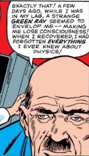 This unidentified physicist was an associate of Henry Pym -- according to Pym, he was the "top man in that field". But all his knowledge of physics had been stolen from him by the extraterrestrial Supramor's green ray and transferred to Supramor. A few days later, Pym (as Giant-Man) confiscated Supramor's station wagon and took it back to his lab so he could examine its electrical circuits. Pym contacted the physicist for assistance; but when he arrived, the physicist reported that he had been bathed in a green ray and subsequently forgot everything he ever knew about physics. The physicist also told Pym that other scientists had reported the same strange occurrence, and that it seemed as though some powerful force was trying to rob mankind of all its scientific knowledge. Presumably, the physicist's knowledge returned to him after Supramor was apprehended by members of his extraterrestrial race. --Tales to Astonish I#67/1 |