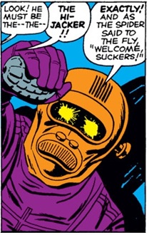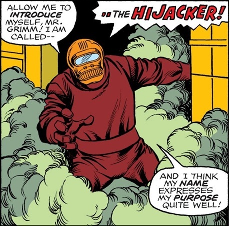Powers/Abilities: Although a poor physical combatant, the Hijacker had a good working knowledge of advanced weaponry, and he could easily turn available equipment into an attack. He wore a padded costume (possibly bulletproof and/or flame-resistant), and a gas mask; originally armed with amnesia-inducing knock-out gas grenades, he also used a van equipped with a giant magnet to rob armored trucks.