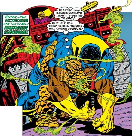 (Marvel Two-in-One I#24) -The Hijacker broke into Stark West, intending to take Stark's inventions; but he ran into trouble from Bill Foster--aka Black Goliath--and the Thing, who were involved in a test procedure there at the time. Realizing he was overpowered, Mitchell escaped and returned with his battle tank (see comments). After some struggle, the two heroes neutralized the tank, then easily apprehended the Hijacker and unmasked him--the Thing knocked Mitchell out with a flick of his finger.