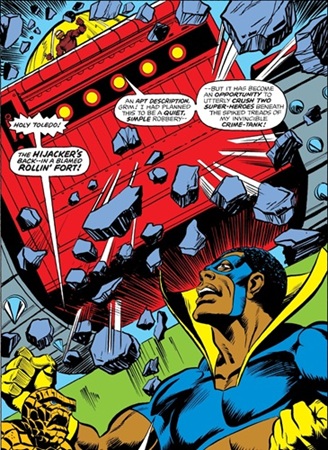 Marvel Two-in-One I#24, p13, pan1 (Hijacker in tank; Thing, Black
