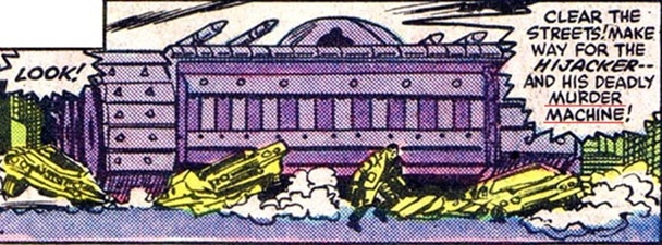 (Marvel Two-In-One I#96)- The Hijacker returned for vengeance on the Thing, after learning the hero was hospitalized following injuries he had sustained at the hands of Gladiator (@ Fantastic Four I#249) and the Champion (@ Marvel Two-in-One Annual#7)--a number of other villains had similarly targeted the Thing, but a group of superheroes had gathered in preparation for this. The Hijacker used a tank similar in appearance to his last one, but it was not as durable, and Iron Man made quick work of it.