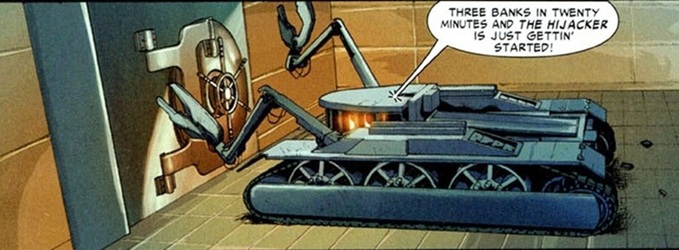 That particular armored truck was carrying a large amount of cash from a bank, and when it was beyond the city limits, the Hijacker struck. Drawing the armored truck into his van with a giant magnet, the Hijacker used a gas grenade to render the three guards unconscious, then he broke into the truck with a standard acetylene blow-torch.