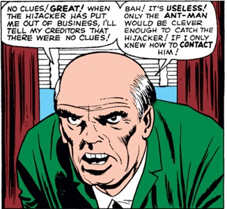 (Tales to Astonish I#40/1) - Mitchell pretended to be infuriated by the police's inability to capture the Hijacker and requested the assistance of Ant-Man (Pym), believing that the small hero would be no threat to him. After arriving at Mitchell's office, Ant-Man figured that the Hijacker would not attack the trucks if he knew they were guarded by a superhero, so he feigned appendicitis, and then he hid out in one of the trucks.